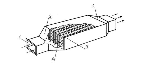 1 - входное поперечное сечение; 2- переходный элемент; 3 - звукопроницаемое покрытие; 4 - звукопоглощающий материал (пластина) Рисунок 4 - Пластинчатый глушитель В зависимости от частотной области вносимые потери пластинчатого глушителя определяются двумя составляющими: ослаблением неоднородностями на входе и удельными потерями распространения вдоль пластин (см. рисунок 5). На низких частотах, когда диаметр присоединенного канала меньше половины длины волны и распространение мод высшего порядка подавлено, ослабление неоднородностями несущественно. На высоких частотах, когда переходный элемент допускает падение звука на пластины под случайными (произвольными) углами, ослабление неоднородностями, обычно составляющее от 6 до 10 дБ, может приводить к увеличению удельных потерь распространения. Дополнительное ослабление неоднородностями эффективно для пластин, в которых изменения внутренней структуры вдоль пути распространения обычно малы.