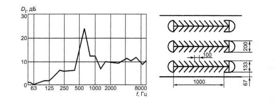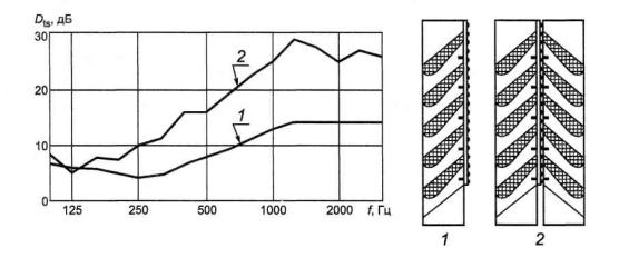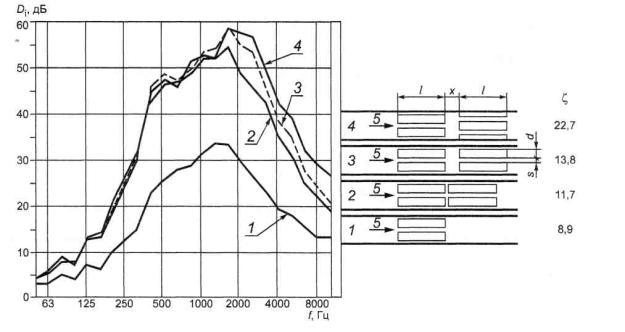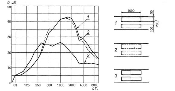 1 - пластины без покрытия; 2 - пластины с перфорированным покрытием; 3 - пластины с частичным покрытием Рисунок 8 - Зависимость вносимых потерь Di от частоты fдля глушителей с обычными пластинами, полученная по результатам измерений при лабораторных испытаниях При выборе и оптимизации пластинчатых глушителей для низкочастотного ослабления особое внимание следует уделять материалам наполнителя, покрытия и внутреннему секционированию (каркасу) пластин. Для улучшения ослабления на высоких частотах ширина воздуховодов должна быть уменьшена, а секционированные пластины следует размещать вдоль канала со смещением в поперечном направлении. Обе эти меры приводят к увеличению потерь давления. В то время как смещение обеспечивает дополнительное ослабление менее 6 дБ, потери давления могут удвоиться (см. рисунок 9).