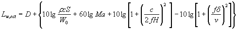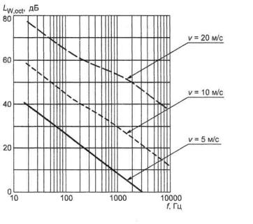 Примечание - Условия измерения по [1] приводят к Δζ= 0 [см. равенство (2)]. 6.1.2.4 Влияние потока на ослабление и генерацию звука Поток со скоростью вплоть до 20 м/с испытывает сильное диссипативное ослабление в воздуховоде. Поток может влиять на рассеяние звука в пластинчатых глушителях двумя способами. Во-первых, скорость звука различается для входного и выходного направлений. Во-вторых, неоднородность профиля скорости вызывает эффект рефракции. Оба эффекта зависят от числа Маха Ма, и ими можно пренебречь для Ма < 0,05. Более важным является регенерация звука потоком. Потоковый шум, измеряемый при лабораторных испытаниях, характеризуется уровнями звуковой мощности, непосредственно связанными со скоростями потока. Эти уровни имеют отношение к безвихревому входному потоку глушителя. Если эти условия не выполняются при испытаниях на месте установки глушителя, например вследствие конструкции всасывающего канала, могут наблюдаться повышенные значения уровней потокового шума. Уровень звуковой мощности, излучаемой глушителем, не может быть меньше уровня звуковой мощности потокового шума. Ослабление, измеренное на месте, часто оказывается меньше измеренного при лабораторных испытаниях, которое определяют без учета потокового шума. Оценка октавного уровня звуковой мощности потокового шума Lw,oct может быть определена по формуле где В - величина, зависящая от типа глушителя и частоты, дБ; v - скорость потока в наиболее узком сечении глушителя, м/с; с - скорость звука в среде, м/с; Ма - число Маха (Ма = v/c); р - статическое давление в канале, Па; S - площадь наиболее узкого поперечного сечения, м2; f - среднегеометрическая частота октавной полосы, Гц; Н - максимальный поперечный размер канала, м; δ - пространственный масштаб, характеризующий высокочастотную спектральную составляющую потокового шума, м; W0 = 1Bt. Уровень звуковой мощности потокового шума изменяется с температурой TB в соответствии с приближенной зависимостью –25lg(T/T0). Для гладкостенных диссипативных пластинчатых глушителей, используемых в тепловом, вентиляционном и кондиционирующем оборудовании, приближение задают значениями В = 58 дБ, δ = 0,02 м. Для данного случая график зависимости, определяемой формулой (13), изображен на рисунке 10; корректированные по характеристике А уровни звуковой мощности LWA для поперечного сечения канала площадью 1 м2 вычисляют затем по формуле