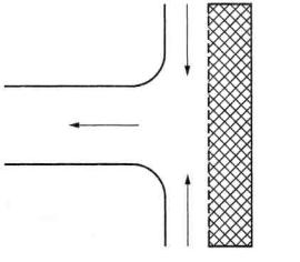 Рисунок 11 - Всасывающее отверстие глушителя с поглощающим экраном Примечание - По сути, ослабление звука изгибами может быть определено как дополнительное ослабление, наблюдаемое в изогнутых каналах глушителей по сравнению с прямыми. Тем не менее, в настоящее время нет стандартных методик измерения ослабления данного вида. На практике влияние облицовки может быть определено путем сравнения конструкций, имеющих жесткие стены, с конструкциями, включающими в себя поглощающие покрытия. Действие дисковых затворов может быть описано с помощью равенства (7). Отношение U/S не изменяется вдоль радиального пути распространения звука. Эффективная длина определяется радиусом диска. Поскольку размеры затворов обычно малы, подавление образования луча не столь важно. Конец канала образует закругленную воронку, позволяющую уменьшить относительно высокие потери давления. При наличии углов необходимо отчетливо различать каналы (каналы с аэродинамическими формами) и обычные вентиляционные трубы. В обтекаемых каналах применяют звукопоглощающие направляющие стабилизаторы (крылья), которые занимают немного места, но могут иметь существенное действие на высоких частотах. В обычных вентиляционных каналах применяют облицовку стен вблизи угла. Если стены имеют выступы, сравнимые по размерам с длиной волны звука, то большая часть звука будет рассеяна и значительно ослаблена. На рисунке 12 показан пример определения потерь при прохождении для поворота (изгиба) канала при наличии или отсутствии звукоизолирующего покрытия.