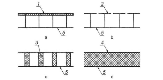 Рисунок 12 - Зависимость потерь при прохождении Dt от частоты f для поворота (изгиба) канала при различных способах размещения звукопоглощающей облицовки стенок (вентиляционная шахта подземного туннеля) 6.2 Реактивные глушители6.2.1 Резонаторные глушители 6.2.1.1 Общие положения Как для облицовки каналов, так и при изготовлении звукопоглощающих пластин применяют ослабляющие звук элементы в форме поглотителей или резонаторов. В специальных приложениях полезно объединять оба вида элементов. На рисунке 13 изображены резонаторы следующих типов: а - звукопоглощающий слой с низким сопротивлением продуванию на жесткой подложке с поперечными секциями, представляющими собой четвертьволновый резонатор; b - аналогичное устройство со слабоперфорированной отверстиями или щелями плоскостью для создания эффекта «бутылочного горла» на пути воздушного звука (резонатор Гельмгольца); с - аналогично секционированная облицовка со стенками из звукопоглощающего материала или без поглотителя; d - аналогичное устройство, облицованное легкой пленкой (фольгой) или пластинами.