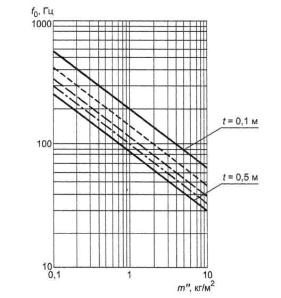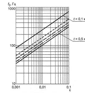 где р - плотность газа, кг/м3; m" - поверхностная плотность пластины или пленки, кг/м2; с и t - те же, что в формуле (15). Для воздуха при нормальных атмосферных условиях а = 60 кг1/2Гц/м1/2. График зависимости (17) показан на рисунке 15. Подходящим выбором материалов и конструкции резонатора можно избежать осаждения отложений и предотвратить их совместную вибрацию с покрытием, которое становится чувствительным к разрушению. Применяют специальную металлическую или пластиковую фольгу. При использовании тонкой фольги существует опасность возбуждения потоком флаттерного шума.