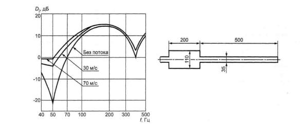 Рисунок 16 - Зависимость вносимых потерь Di от частоты f для однокамерного отражательного глушителя для различных скоростей потока в направлении распространения звука 6.2.2.2 Расширения и расширительные камеры Если диаметр поперечного сечения на выходе глушителя мал по сравнению с длиной волны λ= c/f, то звук отражается от открытого конца обратно в направлении источника звука. В этом случае отражение будет сильнее и, следовательно, звук, излученный наружу, будет слабее, чем при большом диаметре, а также будет больше телесный угол излучения Ω. Для увеличения отраженных потерь Dm на выходе площадь S должна быть как можно меньше и выпускное отверстие должно быть (что предпочтительно) расположено как можно дальше от стены (Ω =4π), а не в стене (Ω = 2π), на ребре (Ω = π) и в углу(Ω = π /2), см. равенство (19):