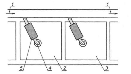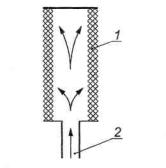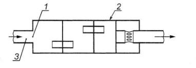 1 - воздухонипроницаемый материал (например, из металлокерамики или спеченного гранулированного металла); 2 - газовая среда под высоким давлением Рисунок 20 - Дросселирующий глушитель для пневматических систем Такие дросселирующие глушители имеют резьбовое окончание для присоединения к трубе. В случае загрязнения их заменяют без очистки паром, моющими средствами или отжигом. Глушители для линий выпускных клапанов повышенной безопасности проектируют как многокаскадную систему сброса давления. Это достигается применением перфорированных металлических листов, которые гарантируют допустимое возрастание давления. Конструкция должна обладать повышенной механической прочностью, так чтобы в момент сброса давления не произошло смятия или разрушения. Следует предотвращать замерзание конденсированной жидкости в глушителе. Для удовлетворения жестких требований к снижению уровня шума перфорированные пластины часто объединяют с диссипативными глушителями. 7 Методы измерений7.1 Лабораторные методы измерений7.1.1 Обзор Применяют следующие методы измерений; - лабораторные измерения для канальных глушителей в соответствии с [1]; - определение вносимых потерь глушителя в каналах без потока, лабораторный ориентировочный метод по [6]; - дополнительные лабораторные измерения для совершенствования и детального анализа канальных глушителей; - определение вносимых потерь для глушителя машины путем измерения уровня звуковой мощности машины с глушителем и без него в соответствии с ГОСТ 31274-2004 и ГОСТ 31275-2002. Метод выбирают в зависимости от области применения глушителя и цели использования полученных результатов. 7.1.2 Методы измерения в соответствии с [1] Методы требуют больших затрат, особенно при определении вносимых потерь в присутствии потока. Поэтому для скоростей потока в воздуховодах между звукопоглощающими пластинами менее 20 м/с обычно пренебрегают эффектами, связанными с потоком. Испытания, проводимые в различных реверберационных камерах на различных испытательных установках, будут показывать малые стандартные отклонения воспроизводимости вносимых потерь до тех пор, пока звуковое поле в глушителе будет образовано плоскими волнами. Однако трудно (вследствие разных причин) избежать возбуждения мод высших порядков вблизи частоты их возникновения и на более высоких частотах. Это может вызывать большие отклонения воспроизводимости измерений. Лабораторные измерения обычно не позволяют экстраполировать характеристики глушителя для больших значений температур, давлений и скоростей потока. 7.1.3 Методы измерения в соответствии с [6]. Лабораторные измерения вносимых потерь без потока в малых глушителях для систем кондиционирования и вентиляции и аналогичных областей применения могут быть выполнены в соответствии с [6]. Малое стандартное отклонение воспроизводимости для измерений в различных лабораториях обеспечивают выбором размеров источника звука и испытательных каналов перед глушителем и позади него, а также размеров замещающей трубы. 7.1.4 Дополнительные измерения для канальных глушителей Глушители с прямыми каналами или воздуховодами для газового потока могут быть детально обследованы путем перемещения микрофона вдоль канала. Этот метод позволяет установить распределение звукового давления, аналогичного показан