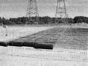 Рис. 2. Укладка одноосной георешетки 4.4. Один край одноосной (поперечной) георешетки прикрепляется к двухосной (базовой) георешетке соединительными хомутами. Таким образом, прикрепляется каждая вторая ячейка поперечной диафрагмы. Прикрепление одноосной (поперечной) георешетки к двухосной (базовой) георешетке показано на рис. 3.