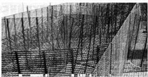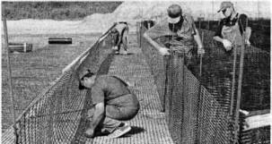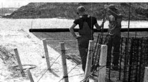 Рис. 4. Подъем, натяжение и закрепление вертикальных поперечных конструкций Натяжение осуществляется за счет скручивания проволоки, прикрепляющей край георешетки к фиксирующей стойке. Максимальная длина для нормальной натяжки составляет 30 м. При большей длине необходимо создавать дополнительные точки, обеспечивающие натяжение. Если натяжение будет недостаточным, то его необходимо натянуть дополнительно с обоих краев георешетки.