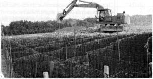 Рис. 7. Узловое соединение диагональных диафрагм и поперечных георешеток. 4.7. Первые два ряда ячеек заполняются щебнем на высоту 0,5 м (половину толщины геоматраца). Затем первый ряд заполняется на всю высоту. Заполнение ячеек продолжается в такой же последовательности: следующий ряд заполняется наполовину, а предыдущий - полностью. Для возможности движения механизированных средств поверх геоматраца должен быть отсыпан защитный слой из щебня толщиной 15 см. Процесс заполнения ячеек щебнем приведен на рис. 8. и 9. 4.8. Демонтаж натягивающих приспособлений производится после того, как геоматрац полностью сформирован и засыпан щебнем. 4.9. Отсыпка земляного полотна над геоматрацем производится послойно, равномерно по всей ширине насыпи. Превышение толщины слоя более чем на 0,5 м не допускается.