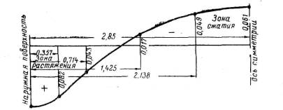 Примечание. Плюс относится к зоне растяжения, минус - к зоне сжатия. Пусть также известна температурная кривая нулевых напряжений (приложение III) и ее ординаты представлены в строке 2 табл. 1. Разности ординат кривой невыгоднейшего распределения температуры и ординат температурной кривой нулевых напряжений приведены в строке 3 табл. 1. Эти разности необходимо умножить на 0,01 мм/м град. Результаты умножения записаны в строке 4 табл. 1. По приведенным в этой строке ординатам температурных свободных деформаций строим кривую и пересекаем ее горизонтальной прямой, так, чтобы площади выше и ниже секущей прямой были равны между собой. Полученная таким образом эпюра и является эпюрой термоупругих деформаций, ординаты которой в мм/м выражают растягивающие и сжимающие деформации в соответствующих точках сечения опоры. Величины полученных ординат растягивающих и сжимающих термоупругих деформаций в кладке бетонной опоры представлены в строке 5 табл. 1 и на рис. 2.