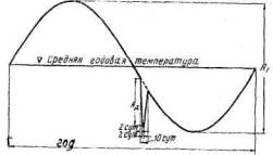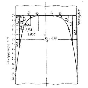 где λд - значение коэффициента теплопроводности для данного бетона. Пример. Построить невыгоднейшую кривую распределения температур в кладке бетонной опоры толщиной 5,7 м. По карте изолиний (см. рис. 4 и 5) в районе, в котором построена опора, амплитуда годового хода температуры воздуха Аг равна 38,1º; наибольшие за декаду отклонения среднесуточной температуры воздуха от линии годового хода Ад = 20,5°. Теплопроводность бетона равна 1,7 ккал/м град. час.