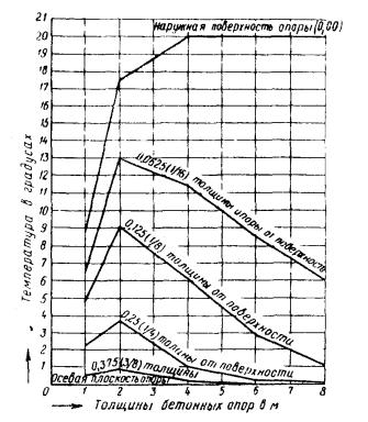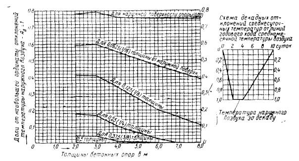 Рис. 8 Из графиков (см. рис. 6 и 7) находим ординаты кривых распределения температуры под влиянием годового хода и декадных отклонений температуры воздуха. Поскольку графики для определения ординат невыгоднейшего распределения температуры были составлены при коэффициенте теплопроводности бетона 1,1 ккал/м град, час, то расчетная толщина вф опоры при пользовании графиками определяется по формуле
