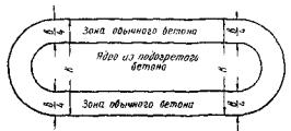 Ординаты температурной кривой нулевых напряжений приведены на рис. 11. Приложение IVМЕТОДИЧЕСКИЕ УКАЗАНИЯ ПО БЕТОНИРОВАНИЮ ОПОР С РЕГУЛИРОВАНИЕМ ТЕМПЕРАТУРНОГО РЕЖИМА УКЛАДЫВАЕМОГО БЕТОНА1. Подогретый бетон следует укладывать в ядро опоры, удаленное от наружных граней на расстояние, равное 1/4 толщины опоры (рис. 12). 2. Подогрев бетона, укладываемого в ядро опоры, до требуемой температуры следует производить за счет подогрева воды.
