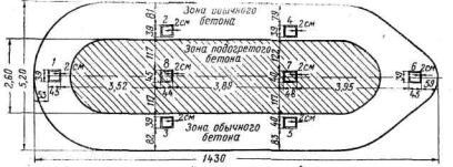 где Sг - площадь поперечного сечения ядра в м2, в которое укладывается подогретый бетон; h - высота слоя бетонирования в м; Vб - объем одного замеса в м3; 2 - количество первых замесов, укладываемых в наружный слой, согласно п. 8. 17. Необходимо установить телефонную связь бетонного завода непосредственно с местом производства работ, для чего на верху бетонируемой опоры должен быть установлен телефон. 18. При устройстве опалубки должно быть сделано достаточное количество рештаков для раздельной укладки бетона в ядро и в наружный слой. Для укладки подогретого бетона в ядро должно быть сделано не менее 2-х специальных рештаков. Количество рештаков для наружного слоя устраивается в зависимости от удобства переброски и разравнивания бетона. В качестве примерной предлагается схема расположения рештаков, показанная на рис. 13 для опоры толщиной 5,2 м и длиной 14,3 м.