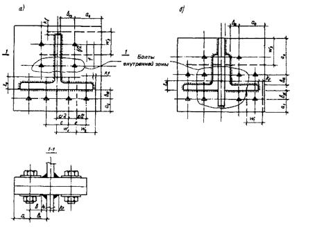 Nmin - меньшее из значений расчетных усилий Nbs и Nbh Для одного болта, вычисленных по формулам (1) и (9). 7.6 Прочность элементов, ослабленных под болты, следует проверять с учетом полного ослабления сечений отверстиями под болты. 7.7 В односрезных соединениях количество болтов должно быть увеличено против расчета на 10%. 7.8 Расчет на выносливость фрикционно-срезных соединений следует выполнять в соответствии с требованиями п. 9.2 СНиП II-23-81*, относя соединения с элементами из стали с временным сопротивлением разрыву более 420 МПа ко 2-й группе конструкций, менее 420 МПа - к 3-й группе табл. 2. 8 Фланцевые соединения8.1 Рекомендации настоящего раздела следует соблюдать при проектировании, изготовлении и монтажной сборке фланцевых соединений элементов открытого профиля (двутавров, тавров, швеллеров и т.п.) стальных конструкций производственных зданий, подверженных растяжению, растяжению с изгибом при однозначной эпюре растягивающих напряжений σmin/σшах ≥ 0,5), а также действию местных поперечных усилий. Рекомендации не распространяются на фланцевые соединения: воспринимающие знакопеременные нагрузки, а также многократно действующие подвижные, вибрационные или другого вида нагрузки с числом циклов свыше 105 при коэффициенте асимметрии напряжений в соединяемых элементах р = σmin/σшах ≤ 0,8; эксплуатируемые в сильноагрессивной среде. 8.2 Фланцевые соединения следует выполнять только с предварительно напряженными высокопрочными болтами. Величину предварительного натяжения болтов В0 для расчетов следует принимать равной В0=0,9Bp=0,9Rbh·Abn, (11) где Вр - расчетное усилие растяжения болта; Rbh = 0.7 Rbun - расчетное сопротивление растяжения болтов; Rbun - нормативное сопротивление стали болтов; АЬп - площадь сечения болта нетто. 8.3 Для фланцевых соединений следует применять высокопрочные болты М20, М24 и М27 из стали 40Х «селект» исполнения ХЛ с нормативным временным сопротивлением Rbun не более 1080 МПа (110 кгс/мм2), а также гайки высокопрочные и шайбы к ним по ГОСТ 22353-77- ГОСТ 22356-77. 8.4 Для фланцев следует применять листовую сталь по ГОСТ 19903-74* марки 09Г2С-15 по ГОСТ 19281-89 и 14Г2АФ-15 по ТУ 14-105-465-82 с гарантированными механическими свойствами в направлении толщины проката. 8.5 Фланцы могут быть выполнены из других марок низколегированных сталей по ГОСТ 19281-89, предназначенных для строительных стальных конструкций, при этом: сталь должна быть не ниже 12-й категории; временное сопротивление и относительное сужение стали в направлении толщины проката должны быть σbz ≥ 0,8σb, ψz≥ 20% (где σb - нормативное значение временного сопротивления для основного металла, принимаемое по стандартам или техническим условиям). 8.6 При конструировании фланцевых соединений болты следует располагать безмоментно относительно центра тяжести соединяемого элемента с учетом неравномерности распределения внешних усилий между болтами наружной и внутренней зон (рис. 1) в соответствии с табл. 7. Предельное усилие на один болт внутренней зоны следует принимать Ni = 0,9 Вр. Таблица 7