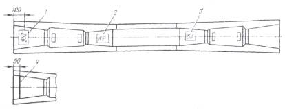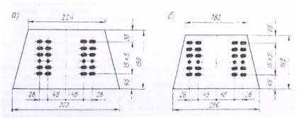 2.2.1. Марка шпалы состоит из двух буквенно-цифровых групп, разделенных дефисом. Первая группа содержит обозначение типа шпалы в зависимости от конструкции рельсового скрепления: Ш1-для раздельного клеммно-болтового скрепления КБ с болтовым прикреплением подкладки к шпале; Ш2-для нераздельного клеммно-болтового скрепления БПУ с болтовым прикреплением подкладки или рельса к шпале. Вторая группа указывает вариант исполнения подрельсовой площадки шпалы в соответствии с табл. 1. 2.2.2. Форма и размеры шпал должны соответствовать указанным в табл. 1 и на рис. 1-4. Таблица 1