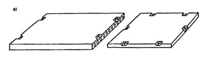 Рис. 1. Крупноразмерные сборные элементы жилых зданий а ¾ стеновые панели; б ¾ плиты перекрытий; в ¾ кровельные плиты; г ¾ объемные блоки Панелью называется плоскостной сборный элемент, применяемый для возведения стен и перегородок. Панель, высотой на этаж и длиной в плане не менее размера помещения, которое она ограждает или разделяет, называется крупной панелью, панели других размеров называются мелкими панелями. Сборной плитой называется плоскостной элемент заводского изготовления, применяемый при возведении перекрытий, крыш и фундаментов. Блоком называется самоустойчивый при монтаже сборный элемент преимущественно призматической формы, применяемый для возведения наружных и внутренних стен, фундаментов, устройства вентиляции и мусоропроводов, размещения электротехнического или санитарно-технического оборудования. Мелкие блоки устанавливают, как правило, вручную; крупные блоки — с помощью монтажных механизмов. Блоки могут быть сплошными и пустотелыми. Крупные блоки бетонных зданий выполняются из тяжелого, легкого или ячеистого бетона. Для зданий высотой один-два этажа при предполагаемом сроке службы не более 25 лет могут применяться блоки из гипсобетона. Объемным блоком называется предварительно изготовленная часть объема здания, огражденная со всех или некоторых сторон. Объемные блоки могут проектироваться несущими, самонесущими и ненесущими. Несущим называется объемный блок, на который опираются расположенные над ним объемные блоки, плиты перекрытия или другие несущие конструкции здания. Самонесущим называется объемный блок, у которого плита перекрытия поэтажно опирается на несущие стены или другие вертикальные несущие конструкции здания (каркас, лестнично-лифтовой ствол) и участвует вместе с ними в обеспечении прочности, жесткости и устойчивости здания. Ненесущим называется объемный блок, который устанавливается на перекрытие, передает на него нагрузки и не участвует в обеспечении прочности, жесткости и устойчивости здания (например, санитарно-техническая кабина, устанавливаемая на перекрытие). Сборные здания со стенами из крупных панелей и перекрытиями из сборных плит называются крупнопанельными. Наряду с плоскостными сборными элементами в крупнопанельном здании могут применяться ненесущие и самонесущие объемные блоки. Сборное здание со стенами из крупных блоков называется крупноблочным. Сборное здание, выполненное из несущих объемных блоков и плоскостных сборных элементов, называется панельно-блочным. Сборное здание, выполненное целиком из объемных блоков, называется объемно-блочным. Монолитные и сборно-монолитные здания по методу их возведения рекомендуется применять следующих типов: с монолитными наружными и внутренними стенами, возводимыми в скользящей опалубке (рис. 2, а) и монолитными перекрытиями, возводимыми в мелкощитовой опалубке методом «снизу-вверх» (рис. 2, б), или в крупнощитовой опалубке перекрытий методом «сверху—вниз» (рис. 2, в); с монолитными внутренними и торцевыми наружными стенами, монолитными перекрытиями, возводимыми в объемно-переставной опалубке, извлекаемой на фасад (рис. 2, г), или в крупнощитовых опалубках стен и перекрытий (рис. 2, д). Наружные стены в этом случае выполняются монолитными в крупнощитовой и мелкощитовой опалубках после возведения внутренних сте