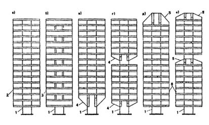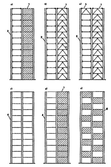 Рис. 4. Каркасные конструктивные системы а, б — связевые с вертикальными диафрагмами жесткости; в — то же, с распределительным ростверком в плоскости вертикальной диафрагмы жесткости; г — рамная; д — рамно-связевая с вертикальными диафрагмами жесткости; е — то же, с жесткими вставками 1 — вертикальная диафрагма жесткости; 2 — каркас с шарнирными узлами; 3 — распределительный ростверк; 4 — рамный каркас; 5 — жесткие вставки При связевой каркасной системе применяется безригельный каркас или ригельный каркас с нежесткими узлами ригелей с колоннами. При нежестких узлах каркас практически не участвует в восприятии горизонтальных нагрузок (кроме колонн, примыкающих к вертикальным диафрагмам жесткости), что позволяет упростить конструктивные решения узлов каркаса, применять однотипные ригели по всей высоте здания, а колонны проектировать как элементы, работающие преимущественно на сжатие. Горизонтальные нагрузки от перекрытий воспринимаются и передаются основанию вертикальными диафрагмами жесткости в виде стен или сквозных раскосных элементов, поясами которых служат колонны (см. рис. 4). Для сокращения требуемого количества вертикальных диафрагм жесткости их рекомендуется проектировать непрямоугольной формы в плане (уголковой, швеллерной и т.п.). С той же целью колонны, расположенные в плоскости вертикальных диафрагм жесткости, могут объединяться распределительными ростверками, расположенными в верху здания, а также в промежуточных уровнях по высоте здания. В рамной каркасной системе вертикальные и горизонтальные нагрузки воспринимает и передает основанию каркас с жесткими узлами ригелей с колоннами. Рамные каркасные системы рекомендуется применять для малоэтажных зданий. В рамно-связевой каркасной системе вертикальные и горизонтальные нагрузки воспринимают и передают основанию совместно вертикальные диафрагмы жесткости и рамный каркас с жесткими узлами ригелей с колоннами. Вместо сквозных вертикальных диафрагм жесткости могут применяться жесткие вставки, заполняющие отдельные ячейки между ригелями и колоннами. Рамно-связевые каркасные системы рекомендуется применять, если необходимо сократить количество диафрагм жесткости, требуемых для восприятия горизонтальных нагрузок. В каркасных зданиях связевой и рамно-связевой конструктивных систем наряду с диафрагмами жесткости могут применяться пространственные элементы замкнутой формы в плане, называемые стволами. Каркасные здания со стволами жесткости называют каркасно-ствольными. Каркасные здания, вертикальными несущими конструкциями которых являются каркас и несущие стены (например, наружные, межсекционные, стены лестничных клеток), называются каркасно-стеновыми. Здания каркасно-стеновой конструктивной системы рекомендуется проектировать с безригельным каркасом или с ригельным каркасом, имеющим нежесткие узлы соединения ригелей с колоннами. 2.6. В ствольных конструктивных системах вертикальными несущими конструкциями являются стволы, образуемые преимущественно стенами лестнично-лифтовых шахт, на которые непосредственно или через распределительные ростверки опираются перекрытия. По способу опирания междуэтажных перекрытий различают ствольные системы с консольным, этажерочным и подвесным опиранием этажей (рис. 5).