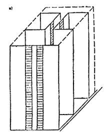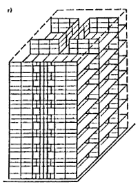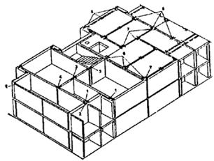 Рис. 22. Двухмерные (плоские) расчетные схемы бескаркасных зданий а — вертикальная диафрагма с проемами; б — плоский составной стержень; в ¾ заменяющая рама; г — ферменная модель При трехмерной расчетной схеме (рис. 23) здание рассматривается как пространственная система, способная воспринимать приложенную к ней пространственную систему сил. Трехмерная расчетная схема наиболее точно учитывает особенности взаимодействия несущих конструкций, но расчет на ее основе наиболее сложен.