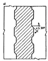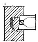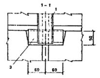 Рис. 11. Схемы восприятия сдвигающих усилий в вертикальном стыке панельных стен а, б — шпонками; в — замоноличенными арматурными связями; г — сваркой закладных деталей 1 — сварная арматурная связь; 2 — то же, петлевая; 3 — накладка, приваренная к закладным деталям Возможен комбинированный способ восприятия сдвигающих усилий, например, бетонными шпонками и плитами перекрытий. Шпонки рекомендуется проектировать трапециевидной формы (рис. 12). Глубину шпонки рекомендуется принимать не менее 20 мм, а угол наклона площадки смятия к направлению, перпендикулярному плоскости сдвига, не более 30°. Минимальный размер в плане плоскости стыка, через которую замоноличивается стык, рекомендуется принимать не менее 80 мм. Следует предусматривать уплотнение бетона в стыке глубинным вибратором.
