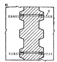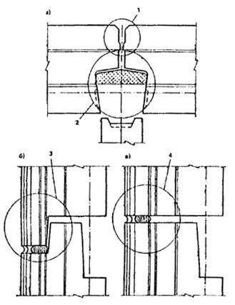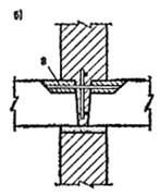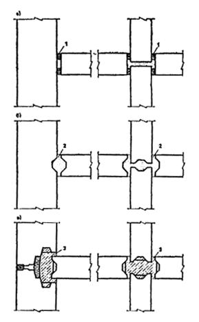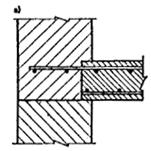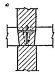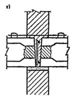 Рис. 10. Контактно-платформенные стыки сборных стен а — наружных; б, в — внутренних Проектные марки раствора горизонтальных швов рекомендуется назначать по расчету на силовые воздействия, но не ниже: марки 50 — для условий монтажа при положительных температурах, марки 100 — для условий монтажа при отрицательных температурах. Класс бетона по прочности на сжатие замоноличивания горизонтального стыка рекомендуется назначать не ниже соответствующего класса бетона стеновых панелей. 2.11. Сдвигающие усилия в горизонтальных стыках панельных стен при строительстве в несейсмических районах рекомендуется воспринимать за счет сопротивления сил трения. Сдвигающие усилия в вертикальных стыках панельных стен рекомендуется воспринимать одним из следующих способов: бетонными или железобетонными шпонками, образуемыми путем замоноличивания полости стыка бетоном (рис.11, а, б); бесшпоночными соединениями в виде замоноличенных бетоном арматурных выпусков из панелей (рис. 11, в); сваренными между собой закладными деталями, заанкеренными в теле панелей (рис. 11, г).