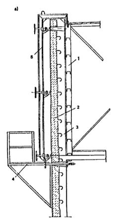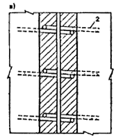 Рис. 26. Наружные стены монолитных зданий а — двухслойная; б — трехслойная с наружным слоем из сборной панели скорлупы; в — то же, с внешними слоями из монолитного бетона 1 — блочная опалубка; 2 — панель-скорлупа; 3 — монолитный бетон стены; 4 — рабочие подмостки; 5 — крепежная система панели-скорлупы; 6 — утеплитель; 7 — связь; 8 — щиты опалубки; 9 — бадья; 10 — рассекатель; 11 — бетон 5.89. Конструктивное армирование стен следует предусматривать двух типов в зависимости от напряженного состояния стены: если от расчетных нагрузок в сечении стены возникают растягивающие напряжения или в полностью сжатом сечении стены минимальные сжимающие напряжения в бетоне s £ 1 МПа (10 кгс/см2), то конструктивное армирование рекомендуется принимать по всему полю стены, при этом количество вертикальной и горизонтальной арматуры должно быть не менее 0,025 % соответствующего поперечного сечения стены; в остальных случаях конструктивную арматуру устанавливают только по контуру стены, а в пересечениях несущих стен, в местах резкого изменения толщин стен, у граней дверных и оконных проемов и у граней отверстий устанавливают вертикальную арматуру площадью сечения не менее 1 см3. Вертикальную конструктивную арматуру рекомендуется проектировать в виде гнутых (Г-образных) каркасов. Стыкование вертикальных каркасов по высоте здания рекомендуется производить в уровне перекрытий внахлестку без сварки. Величина перепуска определяется расчетом. При конструктивном армировании стен величина перепуска принимается не менее 200 мм независимо от диаметра вертикальной арматуры. При сборных перекрытиях стыкование арматурных каркасов рекомендуется производить сдельными стержнями, устанавливаемыми между торцами плит перекрытий. Роль горизонтальной конструктивной арматуры в случае применения неразрезных монолитных, а также сборных и сборно-монолитных перекрытий, опертых по контуру или трем сторонам, выполняет конструктивная арматура в перекрытиях, расположенная параллельно стенам. В случае применения сборных балочных перекрытий рекомендуется устанавливать дополнительную горизонтальную арматуру в местах сопряжения их с монолитными стенами. 5.90. Расчетное армирование стен из монолитного бетона на внецентренное сжатие из плоскости рекомендуется выполнять арматурными блоками, собираемыми из Г-образных каркасов на строительной площадке. Следует предусматривать дифференцированное расчетное армирование по высоте здания в соответствии с изменением усилий в конструкциях. Уменьшение расчетного армирования по высоте здания следует осуществлять за счет более редкого расположения вертикальных каркасов и (или) уменьшения диаметра вертикальных стержней. 5.91. Повышение трещиностойкости монолитных стен (ограничение по трещинообразованию или ширине раскрытия трещин) может быть достигнуто за счет выбора рациональных конструктивных систем и конструктивно-технологического решения стен; рационального применения материалов в наружных и внутренних стенах в соответствии с указаниями пп. 5.92—5.93. 5.92. Для предотвращения образования сквозных вертикальных температурно-усадочных трещин рекомендуется назначать отношение длины стены к высоте этажа не более двух. В случае, если длина стены превышает вдвое высоту этажа, то в глухих участках стен рекомендуется устраив