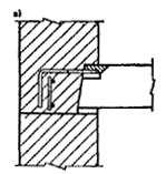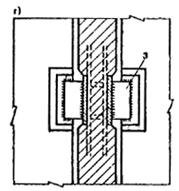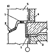 Рис. 37. Схемы изоляции устья вертикального открытого стыка резиновым профилем а — без смещения плоскостей сопрягаемых панелей; б — при допустимом смещении плоскостей сопрягаемых панелей 1 — резиновый профиль