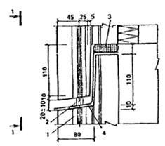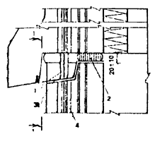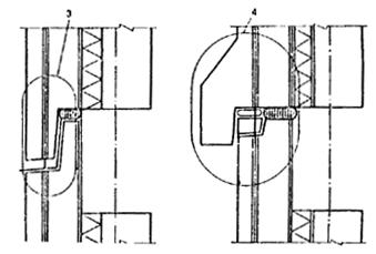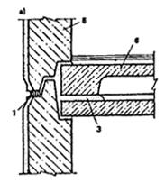 Рис. 39. Схема герметизации устья горизонтального открытого стыка с выносным противодождевым зубом 1 — водоотбойный экран; 2 — уплотняющая прокладка при зазоре стыка 10 мм — диаметром 30 — 40 мм, при зазоре 10 мм — диаметром 20 мм, при зазоре 30 мм — диаметром 40 — 50 мм; 3 — водоотводящий фартук; 4 — направляющий профиль 5.119. В колодцах вертикальных стыков всех типов следует предусматривать воздухоизоляцию с помощью воздухозащитных лент и (или) уплотняющих прокладок, устанавливаемых на клеях (рис. 40).