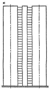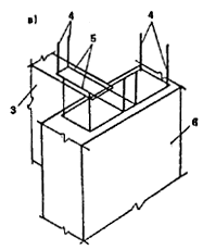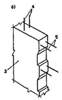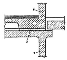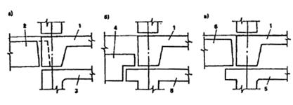 Рис. 14. Горизонтальные стыки панельно-блочных зданий с опиранием плиты перекрытия а — с помощью опорных «пальцев» плит перекрытий; б, в — на консольный выступ вверху объемного блока 1 — плита пола объемного блока; 2 — плита перекрытия с опорными «пальцами»; 3 — потолочная плита объемного блока; 4 — плита перекрытия с подрезкой на опоре; 5 — потолочная плита объемного блока с консолью для опирания плиты перекрытия; 6 — укороченная плита перекрытия При выборе способа опирания плиты перекрытия на объемный блок рекомендуется учитывать, что опирание плит на консольные выступы (рис. 14, в) обеспечивает четкую схему передачи вертикальных нагрузок от вышерасположенных объемных блоков, но требует применения укороченных плит перекрытия, а наличие консольного выступа вверху блока ухудшает интерьер помещения и обусловливает устройство вырезов в примыкающих к объемному блоку перегородках. Опирание плит непосредственно на объемный блок (рис. 14, г) позволяет избежать устройства консольных выступов, но усложняется конструкция узла сопряжения объемных блоков. 2.17. Прочность, пространственную жесткость и устойчивость панельно-блочных зданий рекомендуется обеспечивать совместной работой столбов объемных блоков, несущих стеновых панелей и плит перекрытий, которые должны быть соединены между собой расчетными металлическими связями. Минимальное сечение связей рекомендуется назначать по указаниям п. 2.8. При опирании плит перекрытий только на объемные блоки допускается считать, что каждый из столбов объемных блоков воспринимает только приходящиеся на него нагрузки. 2.18. Грань объемного блока, на стороны которой опирается плита перекрытия, рекомендуется располагать в одной плоскости с гранями стеновых панелей. При проектировании специальной панельно-блочной серии (без необходимости взаимозаменяемости стен панелей и объемных блоков) возможна привязка элементов по рис. 14, а, в, что позволяет обойтись без укорочения плит перекрытий. Монолитные и сборно-монолитные здания 2.19. Монолитные и сборно-монолитные жилые здания рекомендуется проектировать на основе стеновых конструктивных систем. При технико-экономическом обосновании допускается применение ствольных и каркасно-ствольных конструктивных систем. Для монолитных и сборно-монолитных зданий с монолитными или сборно-монолитными наружными стенами рекомендуется применять перекрестно-стеновую конструктивную систему с несущими поперечными и продольными стенами, в том числе наружными. Монолитные и сборно-монолитные перекрытия рассматривают как защемленные по контуру. Сборные перекрытия рассматривают как защемленные стенами и опертые по двум или трем сторонам. Для сборно-монолитных зданий со сборными наружными стенами при наличии сквозных внутренних продольных стен рекомендуется принимать перекрестно-стеновую систему с ненесущими наружными стенами. При наличии отдельных продольных диафрагм жесткости применяется поперечно-стеновая конструктивная система, при которой перекрытия рассматриваются как защемленные стенами по двум противоположным сторонам. Для сборно-монолитных зданий, с защемленными по двум сторонам монолитными перекрытиями, допускается применять поперечно-стеновую конструктивную систему с плоской рамой или радиальным расположением стен. В зависимости о