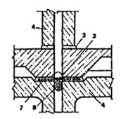 Рис. 6. Схема расположения связей в крупнопанельном здании 1 — между панелями наружных и внутренних стен; 2 — то же, продольных наружных несущих стен; 3 — продольных внутренних стен; 4 — то же, поперечных и продольных внутренних стен; 5 — то же, наружных стен и плит перекрытий; 6 — между плитами перекрытий вдоль длины здания; 7 — то же, поперек длины здания На вертикальных гранях сборных плит рекомендуется предусматривать шпоночные соединения, сопротивляющиеся взаимному сдвигу плит поперек и вдоль стыка. Сдвигающие усилия в стыках плит междуэтажных перекрытий, опирающихся на несущие стены, допускается воспринимать без устройства шпонок и связей, если конструктивное решение узла сопряжения плит перекрытий со стенами обеспечивает их совместную работу за счет сил трения. В вертикальных стыках панелей несущих стен рекомендуется предусматривать шпоночные соединения и металлические горизонтальные связи. Бетонные и железобетонные панели наружных стен рекомендуется не менее чем в двух уровнях (вверху и внизу этажа) соединять связями с внутренними конструкциями, рассчитанными на восприятие усилий отрыва в пределах высоты одного этажа не менее 10 кН (1 тс) на 1 м длины наружной стены вдоль фасада. При самозаклинивающихся стыках наружных и внутренних стен, например типа «ласточкин хвост», связи можно предусматривать только в одном уровне перекрытий и уменьшать вдвое значение минимального усилия на связь. Расположенные в одной плоскости стеновые панели допускается соединять связями только вверху. Сечение связи рекомендуется назначать на восприятие растягивающего усилия не менее 50 кН (5 тс). При наличии связей между расположенными друг над другом стеновыми панелями, а также связей сдвига между стеновыми панелями и плитами перекрытий горизонтальные связи в вертикальных стыках допускается не предусматривать, если они не требуются по расчету. В горизонтальных стыках связи рекомендуется предусматривать в следующих случаях: в стенах, для которых по расчету требуется сквозная вертикальная арматура для восприятия растягивающих усилий, возникающих при изгибе стены в собственной плоскости; для обеспечения устойчивости здания к прогрессирующему разрушению, если другими мерами не удается локализовать разрушение от аварийных особых нагрузок (см. п. 2.1). В этом случае вертикальные связи стеновых панелей в горизонтальных стыках (междуэтажные связи) рекомендуется назначать из условия восприятия ими растягивающих усилий от веса стеновой панели и опертых на нее плит перекрытия, включая нагрузку от пола и перегородок. В качестве таких связей рекомендуется, как правило, использовать детали для подъема панелей; в несущих панельных стенах, к которым не примыкают непосредственно бетонные стены перпендикулярного направления. 2.9. Связи сборных элементов рекомендуется проектировать в виде: свариваемых арматурных выпусков или закладных деталей; замоноличиваемых бетоном арматурных петлевых выпусков, соединяемых без сварки; болтовых соединений. Связи следует располагать так, чтобы они не препятствовали качественному замоноличиванию стыков. Стальные связи и закладные детали должны быть защищены от огневых воздействий и от коррозии. Защита от огневых воздействий должна обеспечивать прочность соединений в течение времени, равного величи