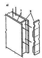 gw — коэффициент, учитывающий относительную влажность воздуха окружающей среды (w); при 10 % £ w < 30 % gw = 2 — 0,02 w; при 30 % £ w < 60 % gw = 1,4 — 0,01 w. В период возведения здания (до начала отделочных работ) относительная влажность воздуха для наружных и внутренних стен определяется для соответствующего региона по СНиП 2.01.01—82. В период выполнения отделочных работ и эксплуатации значение влажности определяется следующим образом. В отопительный период влажность воздуха для внутренних стен определяется по экспериментальным данным, а при их отсутствии — равной 40 %; для наружных стен — равной среднеарифметическому значению между влажностью наружного воздуха и внутри помещения. В остальное время влажность воздуха для наружных и внутренних стен принимаются по СНиП 2.01.01—82. 5.95. При невыполнении ограничений п. 5.93 по разности перемещений сопрягаемых участков наружной и внутренней стен D рекомендуется конструктивное армирование внутренних стен в верхних этажах при высоте здания 12 этажей и более. При этом армируются только участки внутренних стен, сопряженные с наружными стенами. Арматуру следует устанавливать на участке от грани наружной стены до проема или до пересечения со стеной другого направления. Армируют стены трех верхних этажей (включая технический этаж). Армирование рекомендуется производить каркасами в вертикальном и отдельными стержнями в горизонтальном направлении с шагом 400 мм из арматуры диаметром 6 мм, класса А-III, объединенными в пространственный блок или сетками из арматуры диаметром 5 мм, класса Вр-I с ячейкой 250´250 мм у обеих граней стены. СТЕНЫ И ПЕРЕГОРОДКИ С ОБШИВКАМИ ИЗ ЛИСТОВЫХ МАТЕРИАЛОВ 5.96. Наружные стены и перегородки с обшивками из листовых материалов рекомендуется проектировать в виде слоистых каркасных панелей заводского изготовления. Перегородки с обшивками из листовых материалов могут собираться непосредственно на месте возведения из отдельных элементов (перегородки поэлементной сборки). 5.97. Слоистые панели рекомендуется проектировать однорядной разрезки (высотой на этаж). Длину панелей наружных стен рекомендуется принимать равной шагу вертикальных несущих конструкций здания (за вычетом необходимых зазоров). Длину (ширину) панелей перегородок рекомендуется принимать равной 60, 90 и 120 см. Панели слоистых перегородок рекомендуется устанавливать после монтажа несущих конструкций. При конструировании панелей рекомендуется предусматривать возможность беспетлевого монтажа или установку специальных строповочных деталей. Панели с проемами рекомендуется проектировать с использованием стандартных оконных и дверных блоков. 5.98. Наружные стены и перегородки с обшивками из листовых материалов следует проектировать ненесущими. Для предотвращения передачи на них усилий, возникающих при деформациях несущих конструкций зданий, необходимо предусматривать зазоры, уплотняемые упругими прокладками и перекрываемые при необходимости нащельниками. Ненесущие наружные стены и перегородки должны воспринимать и передавать несущим конструкциям здания усилия от непосредственно приложенных к ним нагрузок (ветровых, от подвесного оборудования, ударных и др.). При жестком (например, клеевом) соединении наружной обшивки с каркасом необходимо выполнить расчет панелей наружных стен на усилия от температурных деформаций