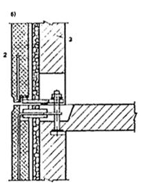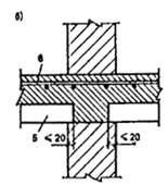 Рис. 9. Контактные стыки сборных стен с опиранием плит перекрытия на а — в — «пальцы»; г — е — консоли стен В комбинированном платформенно-монолитном стыке (см. рис. 8, в) вертикальная нагрузка передается через опорные участки плит перекрытий и бетон замоноличивания полости стыка между торцами плит перекрытий. При платформенно-монолитном стыке сборные плиты перекрытий могут проектироваться как неразрезные. Для обеспечения неразрезности плиты перекрытий необходимо соединять между собой на опорах сварными или петлевыми связями, сечение которых определяют по расчету. Для обеспечения качественного заполнения бетоном полости между торцами плит перекрытий при платформенно-монолитном стыке толщину зазора по верху плиты рекомендуется принимать не менее 40 мм, а внизу плит — 20 мм. При толщине зазора менее 40 мм стык рекомендуется рассчитывать как платформенный. Полость замоноличивания стыка по длине стены может быть непрерывной (см. рис. 8, в, г) или прерывистой (см. рис. 8, д). Прерывистая схема применяется при точечном опирании на стены плит перекрытий (с помощью опорных «пальцев»). При платформенно-монолитном стыке над и под плитой перекрытия необходимо устраивать горизонтальные растворные швы. Конструктивное решение монолитного стыка должно обеспечивать надежное его заполнение бетонной смесью, в том числе при отрицательных температурах воздуха. Прочность бетона замоноличивания стыка назначается по расчету. В комбинированном контактно-платформенном стыке вертикальная нагрузка передается через две опорные площадки: контактную (в месте непосредственного опирания стеновой панели через растворный шов) и платформенную (через опорные участки плит перекрытий). Контактно-платформенный стык рекомендуется преимущественно применять при одностороннем опирании плит перекрытий на стены (рис.10). Толщины растворных швов рекомендуется назначат аналогично швам в платформенном стыке.