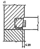 Рис. 27. Закрытый стык наружных стеновых панелей а — вертикальный стык; б, в — варианты горизонтальных стыков 1 — узел (см. рис. 28, 29); 2 — узел (см. рис. 40); 3 — узел (см. рис. 30); 4 — узел (см. рис. 31) В горизонтальных закрытых стыках рекомендуется проектировать противодождевые гребень и зуб. В панелях из ячеистого, а также из легкого бетона толщиной 400 мм и более при качественном выполнении растворных швов допускается предусматривать плоские горизонтальные стыки без гребня и зуба (см. рис. 27, в). Рекомендуемая конфигурация торцов панелей и размеры их профиля для закрытых стыков приведены на рис. 28—31. Диаметр уплотняющих прокладок следует применять дифференцированно с учетом фактического размера зазора стыка в пределах допускаемых отклонений (см. рис. 28—30).