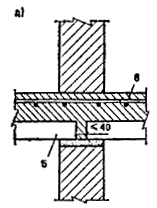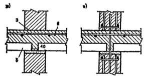 Рис. 8. Монолитные (а — в) и платформенно-монолитные (г — е) стыки сборных стен а, г — наружных трехслойных стен с гибкими связями; б, д — внутренних стен при двухстороннем опирании плит перекрытий; в, е ¾ то же, при одностороннем опирании Сборные плиты перекрытий при монолитных стыках рекомендуется соединять сварными или петлевыми арматурными связями, обеспечивающими неразрезность. Контактный стык (рис 9) рекомендуется применять при опирании плит перекрытия на консольные уширения стен или с помощью консольных выступов («пальцев») плит. При контактных стыках плиты перекрытий допускается опирать на стены без раствора (насухо). В этом случае для обеспечения звукоизоляции полость между торцами плит и стенами необходимо заполнять раствором и предусматривать арматурные связи, превращающие сборное перекрытие в горизонтальную диафрагму жесткости.