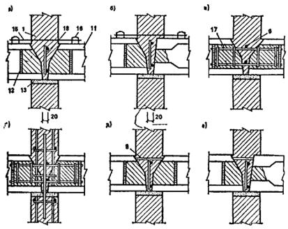 Рис. 20. Комбинированные узлы наружных монолитных стен со сборными многопустотными и сборно-монолитными перекрытиями (1 — 18 — см. рис. 16, 18, 19) а — при многопустотных плитах перекрытия со вскрытыми пустотами и связями в виде отдельных стержней, приваренных к монтажным петлям, или скруток; б — то же, при «усиленном» торце; в — то же, при торце со вскрытыми пустотами и связями в виде отдельных стержней арматурных выпусков из плит; г — то же, при «усиленном» торце; д ¾ то же, при торце со вскрытыми пустотами и связями в виде каркасов, замоноличиваемых в пустотах; е — то же, при торце заделанном бетонными пробками и связями в виде отдельных стержней, приваренных к монтажным петлям; ж — при сборно-монолитном перекрытии