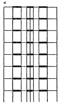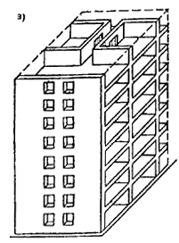 2. КОНСТРУКТИВНЫЕ СИСТЕМЫ Принципы обеспечения прочности, жесткости и устойчивости жилых зданий 2.1. Конструктивной системой здания называется совокупность взаимосвязанных конструкций здания, обеспечивающих его прочность, жесткость и устойчивость. Принятая конструктивная система здания должна обеспечивать прочность, жесткость и устойчивость здания на стадии возведения и в период эксплуатации при действии всех расчетных нагрузок и воздействий. Для полносборных зданий рекомендуется предусматривать меры, предотвращающие прогрессирующее (цепное) разрушение несущих конструкций здания в случае локального разрушения отдельных конструкций при аварийных воздействиях (взрывах бытового газа или других взрывоопасных веществ, пожарах и т.п.). Расчет и конструирование крупнопанельных зданий на устойчивость к прогрессирующему разрушению приведены в прил. 2. 2.2. Конструктивные системы жилых зданий классифицируются по типу вертикальных несущих конструкций. Для жилых зданий применяются следующие типы вертикальных несущих конструкций: стены, каркас и стволы (ядра жесткости), которым соответствуют стеновые, каркасные и ствольные конструктивные системы. При применении в одном здании в каждом этаже нескольких типов вертикальных конструкций различаются каркасно-стеновые, каркасно-ствольные и ствольно-стеновые системы. При изменении конструктивной системы здания по его высоте (например, в нижних этажах — каркасная, а в верхних — стеновая), конструктивная система называется комбинированной. Жилые здания рекомендуется проектировать на основе стеновых конструктивных систем с поперечными и (или) продольными стенами. 2.3. Стены, в зависимости от воспринимаемых ими вертикальных нагрузок, подразделяются на несущие, самонесущие и ненесущие. Несущей называется стена, которая помимо вертикальной нагрузки от собственного веса, воспринимает и передает фундаментам нагрузки от перекрытий, крыши, ненесущих наружных стен, перегородок в т.д. Самонесущей называется стена, которая воспринимает и передает фундаментам вертикальную нагрузку только от собственного веса (включая нагрузку от балконов, лоджий, эркеров, парапетов и других элементов стены). Ненесущей называется стена, которая поэтажно или через несколько этажей передает вертикальную нагрузку от собственного веса на смежные конструкции (перекрытия, несущие стены, каркас). Внутренняя ненесущая стена называется перегородкой. В жилых зданиях рекомендуется, как правило, применять несущие и ненесущие стены. Самонесущие стены допускается применять в качестве утепляющих стен ризалитов, торцов здания и других элементов наружных стен. Самонесущие стены могут применяться также внутри здания в виде вентиляционных блоков, лифтовых шахт и тому подобных элементов с инженерным оборудованием. 2.4. В зависимости от схемы расположения несущих стен в плане здания и характера опирания на них перекрытий (рис. 3) различают следующие конструктивные системы: перекрестно-стеновая с поперечными и продольными несущими стенами; поперечно-стеновая — с поперечными несущими стенами; продольно-стеновая — с продольными несущими стенами.