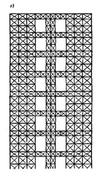 Рис. 23. Пространственные (трехмерные) расчетные схемы бескаркасных зданий. а — фрагмент здания; б — расчетная схема в виде системы консольных стержней; в ¾ то же, пространственного составного стержня; г — пластинчатой системы, рассчитываемой методом конечных элементов 3.11. В дискретных расчетных схемах неизвестные усилия или перемещения определяют для конечного количества узлов системы решения систем алгебраических уравнений. Дискретные расчетные системы наиболее приспособлены к условиям расчета на цифровых вычислительных машинах. В дискретно-континуальных расчетных схемах неизвестные силовые факторы или перемещения задают в виде непрерывных функций вдоль одной из координатных осей (функциональные неизвестные). Неизвестные функции определяются решением краевой задачи для системы обыкновенных дифференциальных уравнений. В континуальных расчетных схемах неизвестные силовые факторы или перемещения задают в виде непрерывных функций вдоль двух или трех координатных осей. Неизвестные функции определяются решением краевой задачи для системы дифференциальных уравнений в частных производных. 3.12. При стержневых расчетных схемах несущая система здания рассматривается в виде: набора параллельно расположенных балок с податливыми связями (составная балка), перекрестной системы балок, многоэтажной многопролетной рамы, решетчатой системы и др. Для определения динамических характеристик здания вся несущая система здания может рассматриваться как один консольный стержень. В расчетных схемах в виде перекрестных стержневых систем несущие балочные элементы расположены в двух плоскостях (вертикальной и горизонтальной). Вертикальные несущие элементы эквивалентны по жесткости стенам, горизонтальные — перекрытиям здания. Принимается, что в местах пересечения несущих элементов их поперечные перемещения одинаковы. Перекрестная расчетная схема позволяет учесть изгиб перекрытий в собственной плоскости. Недостатком расчетной схемы является то, что при ее использовании не учитывается совместность продольных деформаций параллельно расположенных стен, обеспечиваемая в здании стенами перпендикулярного направления. Поэтому расчетную схему рекомендуется применять для расчета на горизонтальные нагрузки только зданий с поперечными несущими стенами при ненесущих продольных стенах. В рамных расчетных схемах стены с проемами рассматриваются как многоэтажные плоские или пространственные многопролетные рамы. Стойками рам являются глухие (без проемов) участки стен, а ригелями — перемычки и перекрытия. При расчете рекомендуется принимать, что ригели имеют переменную жесткость (бесконечно большую в пределах длины простенков и конечную в местах проемов). Для определения усилий в конструкциях зданий на основе рамной расчетной схемы используют универсальные программы расчета рамных систем. При решетчатых расчетных схемах здание в целом или его отдельные элементы (например, стены) заменяют системой вертикальных, горизонтальных и наклонных стержней, шарнирно соединенных между собой. 3.13. При пластинчатых расчетных схемах стены и перекрытия здания рассматриваются как система тонкостенных плоскостных элементов (пластинок), соединенных, как правило, в отдельных узлах. Для расчета отдельных пластинок используют численные