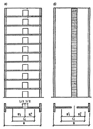 Рис. 24. Расчет вертикальной диафрагмы жесткости с проемами (а) как составного стержня (б) Для каждого столба рекомендуется определять приведенный модуль деформации Еred учитывающий влияние горизонтальных стыков сборных элементов или горизонтальных швов бетонирования стен из монолитного бетона, а также продолжительность действия нагрузки и вычисляемый по формуле Еred = Еb/(jtb + lc Еb/Het), (1) где Еb — начальный модуль упругости бетона стены, принимаемый по нормам проектирования бетонных и железобетонных конструкций; для сборных элементов, изготавливаемых в кассетных установках, а также стен из монолитного бетона, возводимых в переставных опалубках, приведенные в нормах значения начальных модулей упругости следует умножать на коэффициент 0,85; jtb — коэффициент, учитывающий влияние ползучести бетона и зависящий от длительности действия нагрузки; при расчете на кратковременные нагрузки коэффициент jtb принимается равным: 1,2 — для тяжелого бетона и легких бетонов при плотном мелком заполнителе; 1,4 — для легких бетонов на пористом мелком заполнителе; 1,1 — для плотных силикатных бетонов; при расчете на длительно действующие нагрузки коэффициент jtb вычисляется по формуле jtb = 1 + Сb Eb, (2) Сb — предельная мера ползучести бетона, принимаемая для сборных элементов стен по табл. 5; lс — коэффициент податливости горизонтального стыка при сжатии определяемый в зависимости от длительности действия нагрузки по рекомендациям прил. 4. Таблица 5