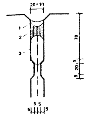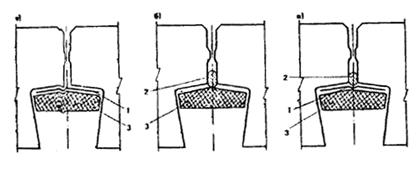 Рис. 28. Схема герметизации устья вертикального закрытого стыка при применении нетвердеющих герметизирующих мастик 1 — защитное покрытие; 2 — нетвердеющая герметизирующая мастика; 3 — уплотняющая прокладка при зазоре стыка 20 мм — диаметром 30 — 40 мм, при зазоре 10 мм — диаметром 20 мм, при зазоре 30 мм — диаметром 40 ¾ 50 мм