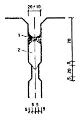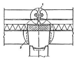Рис. 29. Схема герметизации устья вертикального закрытого стыка при применении отверждающих герметизирующих мастик 1 — отверждающаяся герметизирующая мастика; 2 — уплотняющая прокладка при зазоре стыка 20 мм — диаметром 30 — 40 мм, при зазоре 10 мм — диаметром 20 мм, при зазоре 30 мм — диаметром 40 — 50 мм