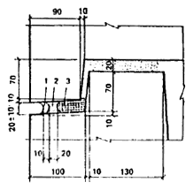 Рис. 30. Схема герметизации устья горизонтального закрытого стыка с противодождевым гребнем при применении нетвердеющих герметизирующих мастик 1 — защитное покрытие; 2 ¾ нетвердеющая герметизирующая мастика; 3 — уплотняющая прокладка при зазоре стыка 20 мм — диаметром 30 — 40 мм, при зазоре 10 мм — диаметром 20 мм, при зазоре 30 мм — диаметром 40 — 50 мм