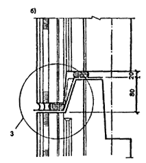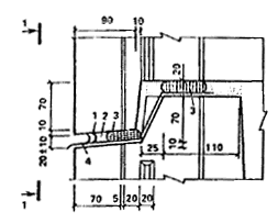 Рис. 38. Схема герметизации устья горизонтального открытого стыка 1 — профиль направляющий; 2 — водоотбойный экран; 3 — уплотняющая прокладка при зазоре стыка 20 мм — диаметром 30 — 40 мм, при зазоре 10 мм — диаметром 20 мм, при зазоре 30 мм — диаметром 40 — 50 мм; 4 — водоотводящий фартук Поверх фартука на верхней горизонтальной плоскости противодождевого гребня следует предусматривать уплотняющую прокладку длиной 500 мм (по 250 мм от оси вертикального стыка). 5.117. В закрытых и дренированных стыках на стыкуемых поверхностях панелей необходимо предусматривать грунтовочные покрытия. В устьях закрытых и дренированных стыков необходимо предусматривать установку уплотняющих прокладок с последующим нанесением по ним герметизирующих мастик. Выбор типа мастики следует производить в соответствии с данными прил. 6 в зависимости от длины стыкуемых панелей и климатических условий района строительства. Необходимо также предусматривать защиту мастик от климатических воздействий с помощью полимерцементных растворов, поливинилхлоридных, бутадиенстирольных, кумаронокаучуковых красок. Защитное покрытие по отверждающимся мастикам допускается не предусматривать. Расположение изолирующих материалов в устьях стыков следует проецировать с заглублением относительно фасадной плоскости панелей наружных стен. 5.118. В стыках открытого типа (рис. 35) на торцевых поверхностях наружных стеновых панелей необходимо предусматривать гидрофобные покрытия. Для водозащиты открытых вертикальных стыков следует проектировать установку в них водоотбойных лент (экранов) и профилей-направляющих из пластмасс на основе ПВХ (рис. 36) или уплотнителей У-образного профиля (рис. 37). Возможно применение других видов водоотбойных экранов. В пересечениях вертикальных и горизонтальных открытых стыков следует предусматривать водоотводящие фартуки (рис. 38). В панелях с выносным противодождевым зубом (рис. 39) водоотводящие фартуки должны располагаться в подрезках, расположенных на верхних торцовых гранях панелей.