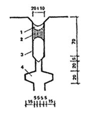 Рис. 33. Схема герметизации устья вертикального дренированного стыка 1 — защитное покрытие; 2 — нетвердеющая герметизирующая мастика; 3 — уплотняющая прокладка при зазоре стыка 20 мм — диаметром 30 — 40 мм, при зазоре 10 мм — диаметром 20 мм, при зазоре 30 мм — диаметром 40 — 50 мм; 4 — декомпрессионная полость