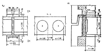 Рис. 41. Схемы к примерам расчета прочности стыков (а — е) Исходные данные. Стеновые панели толщиной t = 160 мм из тяжелого бетона класса B20 (Bw =20 МПа). Панели бетонируются в вертикальном положении в кассетных установках. Расчетное сопротивление бетона сжатию постоянными и длительными нагрузками (с учетом коэффициентов условий работы по СНиП 2.03.01¾84) gb2 = 0,9; gb3 = 0,85 и gb9 = 0,9 Rb = 11,5×0,9×0,85 = 7,92 МПа. Верхнее опорное сечение стеновой панели усилено косвенным армированием в виде двух горизонтальных каркасов с продольными и поперечными стержнями диаметром 8 мм, площадью Atr = 50 мм2. Расстояние между продольными стержнями ltr = 120 мм, шаг поперечных стержней каркаса ctr = 100 мм. Шаг каркасов str = 80 мм. Плиты перекрытий многопустотные толщиной tp = 220 мм из тяжелого бетона класса В15. Диаметр пустот 140 мм, шаг пустот sj = 200 мм, минимальная толщина ребра между пустотами tj = 60 мм. Пустоты заделаны свежеотформованными пробками в заводских условиях. Расчетное сопротивление бетона плиты перекрытия осевому сжатию Rbr = 8,5×0,9×0,9 = 6,9 МПа. Глубина опирания плит перекрытий на стены 70 мм. Средние местные напряжения под платформенными площадками от плит перекрытий spt,1 = 0,5 МПа, spt,2 = 0,2 МПа. Номинальные толщины растворных швов: над плитой перекрытия — 25 мм, под плитой перекрытия — 15 мм. Раствор в горизонтальных швах марки 100. Возможные взаимные смещения сборных элементов в стыке: стеновых панелей dw = 15 мм (при монтаже с применением подкосов); плит перекрытий dp = 10 мм. Суммарное смещение плит перекрытий относительно их проектного положения dpl = l,4 dp = l,4×10 = 14 мм. Суммарный номинальный размер по толщине стены платформенных площадок dpl = 2×70 = 140 мм. Расчетная ширина растворного шва при двухстороннем опирании плит перекрытия bm = t = 160 мм. Для платформенного стыка с двухсторонним опиранием плит перекрытий коэффициент gpl = 0,9. Расчет опорного сечения в уровне растворного