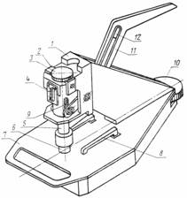 1 - корпус; 2 - скоба; 3 - регулировочный винт нагрузки; 4 - шкала; 5 - шток; 6 - резиновый пуансон; 7 - рабочий столик; 8 - зажимы образца; 9 - пружина; 10 - колесо регулировки зажимов; 11 - рукоятка; 12 - фиксатор рукоятки. (Измененная редакция, Изм. № 1, 3). 3. ПОДГОТОВКА К ИСПЫТАНИЮ3.1. Для определения степени меления применяют проявленную и закрепленную фотобумагу; для покрытия светлых тонов - черного цвета, для темных - белого. При выборе цвета фотобумаги необходимо проверить, насколько контрастный отпечаток образуют на ней частицы прилипающего пигмента. 3.2. Для получения фотобумаги черного цвета ее предварительно засвечивают в течение 2 с. 3.3. Проявление, закрепление и сушку фотобумаги (без обработки в стоп-ванне) производят по ГОСТ 10752-79. 3.4. Проявленную и закрепленную фотобумагу разрезают на полосы шириной 25 мм, погружают в воду при температуре 18 - 25 °С и выдерживают в течение 5 мин, после чего подсушивают фильтровальной бумагой до отсутствия видимых капель воды. 3.3, 3.4. (Измененная редакция, Изм. № 1). 4. ПРОВЕДЕНИЕ ИСПЫТАНИЙ4.1. Степень меления покрытия определяют на окрашенных образцах, изготовленных по ГОСТ 6992-68 и ГОСТ 8832-76, прошедших натурные или ускоренные испытания. Перед испытанием образцы водой не промывают. 4.2. Испытуемый образец покрывают бумагой или полиэтиленовой плнекой с отверстием диаметром 22 - 25 мм так, чтобы оно соответствовало месту определения степени меления на образце, и фиксируют образец зажимами на рабочем столике. (Измененная редакция, Изм. № 1). 4.3. Полосу фотобумаги накладывают на образец эмульсией к покрытию. Снятием рукоятки прибора с фиксатора пуансон плавно опускают на полосу фотобумаги и оставляют на ней в течение 4 - 5 с. Затем пуансон поднимают, передвигают полосу фотобумаги и на чистом участке получают следующий отпечаток. 4.4. Снятие отпечатков продолжают до тех пор, пока на фотобумаге не перестают прилипать частицы пигмента и не просматривается контур отпечатка. 4.5. Степень меления определяют на трех участках поверхности образца. За результат испытания принимают среднее арифметическое значение, которое должно выражаться целым числом. 4.6. Меление покрытия также определяют визуально по отсутствию или наличию частиц пигмента на хлопчатобумажной ткани (белой для темных покрытий и черной для светлых), отделяемых от покрытия при трении его с усилием. 4.6. (Введен дополнительно, Изм. № 3). 5. ОЦЕНКА РЕЗУЛЬТАТОВ ИСПЫТАНИЙ5.1. Оценку степени меления в баллах проводят по таблице.