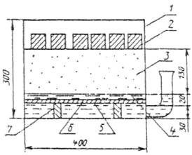 ПРИЛОЖЕНИЕ Г(обязательное) Определение морозостойкости укрепленных грунтовСущность метода заключается в оценки потери прочности на сжатие предварительно водонасыщенных (полностью или частично) образцов из укрепленного грунта после воздействия на них установленного числа циклов замораживания - оттаивания. Средства контроля и вспомогательное оборудование: пресс с механическим или гидравлическим приводом с усилием от 50 до 100 кН по ГОСТ 28840, обеспечивающий скорость перемешивания поршня рабочего цилиндра 3 мм/мин; морозильная камера, обеспечивающая температуру замораживания минус (20±2)°С; вода для насыщения и оттаивания образцов по ГОСТ 2874; устройство для капиллярного водонасыщения (рисунок 1) ванна для оттаивания образцов, оборудованная устройством для поддержания температуры воды (20±2)°С; ванна с гидравлическим затвором для предотвращения высыхания образцов; стеллаж сетчатый. 1 - сосуд; 2 - образцы; 3 - капиллярно-увлажненный песок; 4 - вода; 5 - фильтрованная бумага; 6 - металлическая сетка; 7 - подставка Рисунок 1 - Схема устройства для капиллярного водонасыщения образцов Подготовка к проведению испытания Испытания проводят на образцах, твердеющих в нормальных условиях (температура воздуха (20±2) °С, влажность - не менее 95 %) в течении 28 сут со дня формирования образцов при применении органических вяжущих совместно с минеральными и по истечении суток с момента формирования образцов при применении жидких битумов и битумных эмульсий. Перед загрузкой в морозильную камеру проводят полное или капиллярное водонасыщение образцов из укрепленных грунтов. Полное водонасыщение проводят для укрепленных грунтов, предназначенных для применения в I-III, капиллярное - в IV и V дорожно-климатических зонах. Полное водонасыщение образцов высотой и диаметром 50 мм проводят в ванне с гидравлическим затвором в течении 2 сут, а образцов больших размеров - 3 сут, причем во всех случаях в первые сутки образцы погружают в воду на 1/3 высоты, насыщение проводят в ванне с гидравлическим затвором. Капиллярное водонасыщение проводят через слой воды (см. рисунок 1), постоянно поддерживаемый с помощью уровнемера. В сосуд на металлическую подставку укладывают металлическую сетку или устанавливают емкость с сетчатым дном, которое закрывают фильтрованной бумагой. На фильтрованную бумагу насыпают слой мелкого песка одной фракции толщиной 15 см и через сутки после его насыщения ставят образцы, которые насыщают в течении 3 сут. Для предотвращения высыхания сосуд с образцами помещают в ванну с гидравлическим затвором. Проведение испытания Водонасыщенные образцы загружают в морозильную камеру так, чтобы расстояние между образцами было не менее 50 мм. Если после загрузки камеры температура в ней повысится, то началом замораживания считают момент, когда в морозильной камере установится температура минус 18 °С. Замораживание проводят в течении 4 ч при температуре минус (20±2) °С. Оттаивание образцов после их выгрузки из морозильной камеры проводят в течении 4 ч: в ванне с водой при температуре (20±2) °С, если до испытания на морозостойкость они подвергались полному водонасыщению; во влажном песке, если до испытания на морозостойкость они подвергались капиллярному водонасыщению. Число циклов замораживания - оттаивания образцов в течение суток должно быть не менее одного. Пр