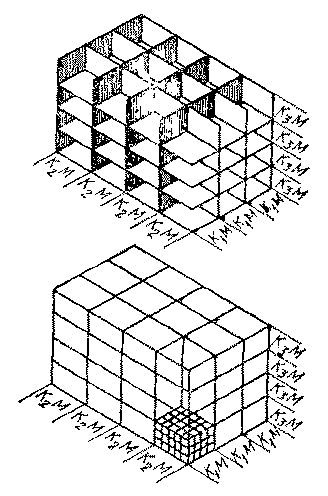 Дата введения 01.07.91 Настоящий стандарт распространяется на здания и сооружения различного назначения всех отраслей народного хозяйства. Стандарт обязателен при разработке: норм, стандартов и других нормативных документов, содержащих данные о регламентации размеров, применяемых для строительства; проектов зданий и сооружений; сортаментов, номенклатур, каталогов и проектов строительных конструкции и изделий; сортаментов, номенклатур, каталогов и проектов оборудования здании, заменяющего конструктивные элементы или составляющего с ними единое целое (шкафы-перегородки, встроенные шкафы, стеллажи в складах и др.), а также оборудования, размеры элементов которого в отдельности и в сочетании с другими элементами или нормированными свободными проходами должны быть согласованы с размерами объемно-планировочных и конструктивных элементов зданий (лифты, эскалаторы, мостовые опорные, подвесные и иные краны, секционные шкафы, элементы оборудования кухонь, столы для аудиторий и др.). Настоящий стандарт не обязателен при проектировании и строительстве зданий и сооружений: уникальных; экспериментальных, если такие отступления обусловлены особенностями эксперимента; с применением изделий, размеры которых не приведены в соответствие с модульной координацией размеров в строительстве, при условии, что отступления не приведут к необходимости изменения установленных размеров других изделий; с размерами, определяемыми специфическими видами оборудования, размеры и форма которых препятствуют применению правил модульной координации размеров в строительстве; реконструируемых, построенных ранее без соблюдения правил модульной координации в строительстве (в том числе пристраиваемых к объектам) и реставрируемых; проектируемых полностью или частично с косоугольными и криволинейными очертаниями, причем отступления в этих случаях допускаются только в той мере, в которой это необходимо в связи с особенностями формы; с размерами, установленными специальными международными соглашениями. Стандарт устанавливает основные положения модульной координации размеров в строительстве зданий и сооружений, являющейся одной из основ унификации и стандартизации размеров в строительстве для обеспечения взаимосогласованности, взаимозаменяемости и ограничения количества типоразмеров строительных изделий и элементов оборудования. Принятые в стандарте специальные термины и пояснения приведены в приложении. 1. ОБЩИЕ УКАЗАНИЯ1.1. Модульная координация размеров в строительстве (МКРС) должна осуществляться на базе модульной пространственной координационной системы и предусматривать предпочтительное применение прямоугольной модульной пространственной координационной системы (черт. 1). При проектировании зданий, сооружений, их элементов, строительных конструкций и изделий на основе модульной пространственной координационной системы применяют горизонтальные и вертикальные модульные сетки на соответствующих плоскостях этой системы. 1.2. МКРС устанавливает правила назначения следующих категорий размеров: основных координационных размеров: шагов (L0, В0) и высот этажей (Н0) зданий и сооружений; координационных размеров элементов: длины (10), ширины (b0), высоты (h0), толщины, диаметра (d0) конструктивных размеров элементов: длины (I), ширины (b), высот