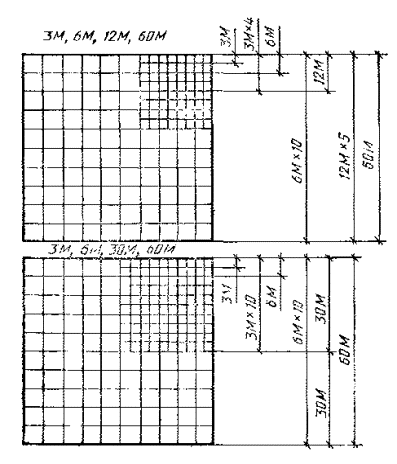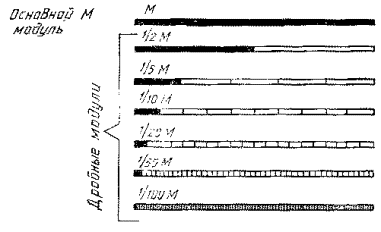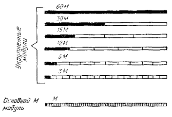 Черт. 2 2.3. Производные модули, указанные в п. 2.2, следует применять до следующих предельных координационных размеров объемно-планировочного элемента, строительной конструкции, изделия или элемента оборудования: 60М - в плане и по высоте без ограничения; 30М - в плане до 18000 мм, при технико-экономических обоснованиях - без ограничения; по высоте - без ограничения; 15М - в плане до 18000 мм; по высоте - без ограничения; 12М - в плане до 12000 мм; по высоте - без ограничения; 6М - в плане до 7200 мм; по высоте - без ограничения; 3М - в плане до 3600 мм, при технико-экономических обоснованиях в плане до 7200 мм, по высоте - без ограничения; М - по всем измерениям в пределах до 1800 мм; 1/2М - то же, до 600 мм; 1/5M - то же, до 300 мм; 1/10М - по всем измерениям в пределах до 150 мм; 1/20M -то же, до 100 мм; 1/50М - то же, до 50 мм; 1/100M - то же, до 20 мм. Принятые пределы применения модулей необязательны для аддитивных (слагаемых) координационных размеров конструктивных элементов. Допускается применение высот этажей 2800 мм, кратных модулю М, за установленным для него пределом. 2.4. Укрупненные модули для размеров в плане каждого конкретного вида зданий, его планировочных и конструктивных элементов, проемов и т.д. должны составлять группу, выбранную из общего ряда, установленного п. 2.2, таким образом, чтобы каждый относительно больший модуль был кратен всем меньшим, чем достигается совместимость членений модульных сеток (черт. 3). В зданиях, состоящих из отдельных связанных между собой корпусов или относительно самостоятельных частей, различных по объемно-планировочной структуре и конструктивной системе, для каждой из частей может применяться своя группа укрупненных модулей из указанных в п. 2.2. 3. КООРДИНАЦИОННЫЕ И КОНСТРУКТИВНЫЕ РАЗМЕРЫ СТРОИТЕЛЬНЫХ ЭЛЕМЕНТОВ И ЭЛЕМЕНТОВ ОБОРУДОВАНИЯ3.1. Координационные размеры конструктивных элементов и элементов оборудования принимают равными соответствующим размерам их координационных пространств. 3.2. Координационные размеры конструктивных элементов устанавливают в зависимости от основных координационных размеров здания (сооружения). 3.3. Координационный размер конструктивного элемента принимают равным основному координационному размеру здания (сооружения), если расстояние между двумя координационными осями здания (сооружения) полностью заполняют этим элементом (черт. 4). Пример группировки укрупненных модулей, обеспечивающей совместимость модульных сеток Черт. 3 Черт. 4 Примечание. Вместо указанных на чертеже координационных размеров L0, l0 (длина) могут быть соответственно приняты B0, b0 (ширина) или Н0, h0{высота). 3.4. Координационный размер конструктивного элемента принимают равным части основного координационного размера здания (сооружения), если несколько конструктивных элементов заполняют расстояние между двумя координационными осями здания (сооружения) (черт. 5а, б).