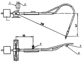 1 - втулка для присоединения подвижной горелки к системе питания топливом; 2 - гибкий шланг; 3 - противовес; 4 - ролик; 5 - сопло; 6 - стабилизатор пламени Рисунок А6 - Подвижная горелка