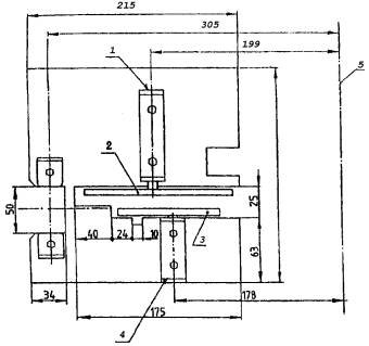 Размеры в миллиметрах 1 - вал приводного механизма; 2 - кулачок приводного механизма; 3 - кулачок с ограничителем хода; 4 - вал ручного управления; 5 - линия, проходящая через центр радиационной панели Рисунок А7 - Монтажная плита системы перемещения подвижной горелки