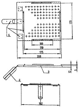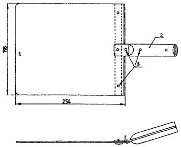 Размеры в миллиметрах 1 - плоский лист из алюминия или нержавеющей стали (толщина 2 мм); 2 - рукоятка; 3 - заклепки Рисунок А10 - Экранирующая пластина