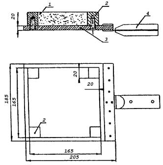 Размеры в миллиметрах 1 - плита из минерального волокна; 2 - угловая стойка с самонарезным винтом; 3 - основание образца имитатора; 4 - рукоятка Рисунок А11 - Образец-имитатор